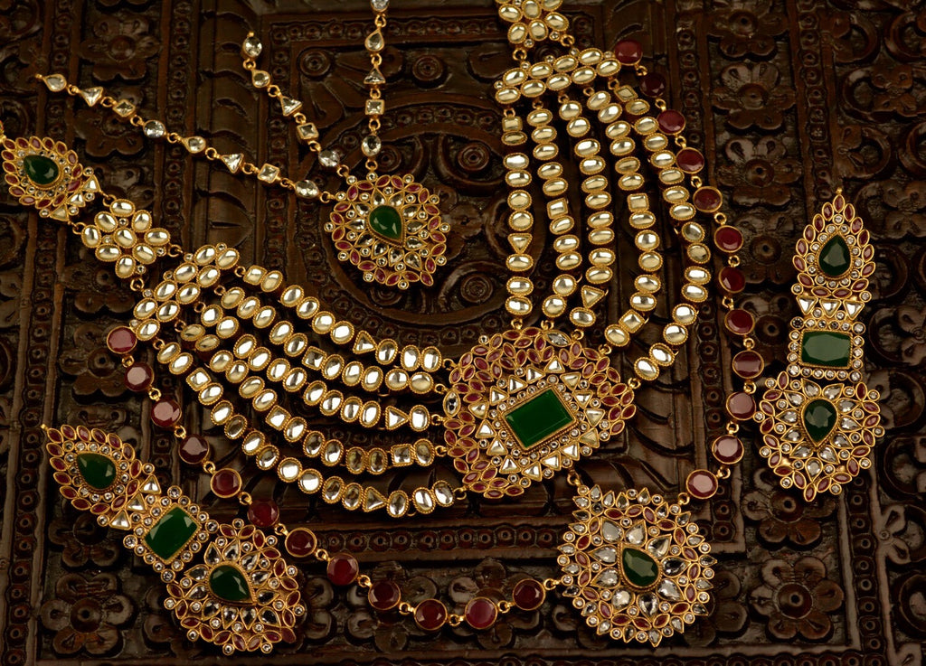 22K gold plated multi layered kundan neclace set in semiprecious stones