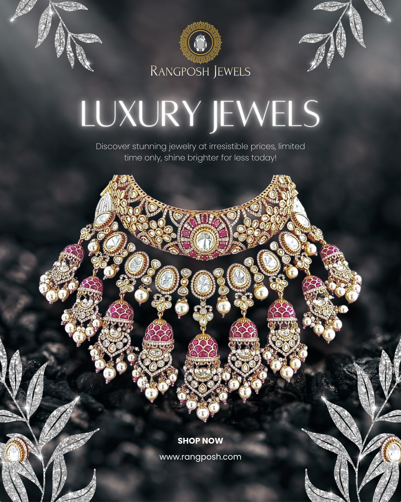 set includes a choker and a separate necklace. Combining the allure of traditional Kundan craftsmanship with the brilliance of American diamonds, this set exudes grace and sophistication. Elevate any ensemble with its timeless elegance, perfect for weddings. Make a statement that transcends time with this captivating ensemble."